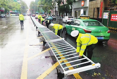 在天津路老实验高中路段,大风吹倒了道路中央的隔离护栏。见此情况,交巡警黄石港大队民警辅警紧急上前,多人协力将护栏扶起。