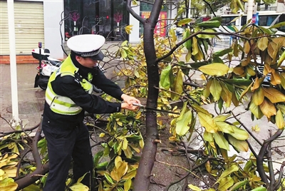 当天早上,黄石大道颐阳路口,路边一棵树被风刮倒,倒下的树枝占据了黄石大道至颐阳路的右转车道,影响车辆通行。交巡警黄石港大队民警李璠赶忙上前,打算将树枝移出路面。