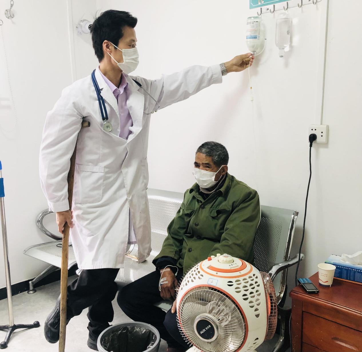 4月16日,天空飘起绵绵细雨,笔者驱车来到阳新县王英镇谷贞村的卫生室,眼前这位身着白大褂拄着木拐杖的村医就是我们今天要采访的主人公,他正忙着给前来看病的村民问诊、取药、配药、消毒、挂吊瓶,动作十分娴熟。