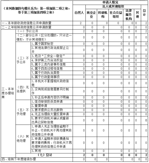 全年共接收政府信息公开申请2件,全部依法依规进行办理。本年度未发生针对政府信息公开事务的行政复议或行政诉讼。