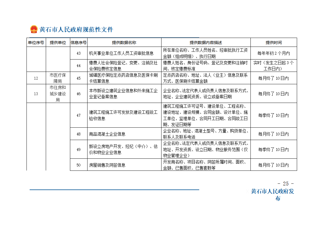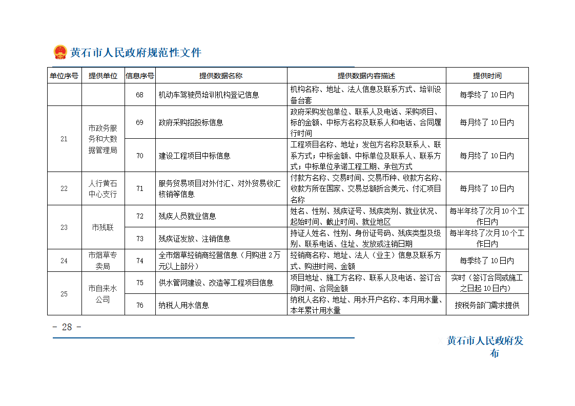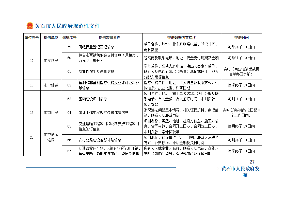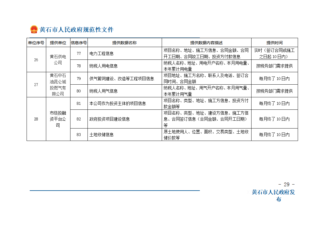 第十条 税费征收保障成员单位按照保障办确定的涉税费信息的内容、流程和时限,通过“黄石市政务信息资源共享管理平台”向保障办传递涉税费信息,并对信息、数据的真实性、准确性负责。当期没有产生信息的,实行零报送制。