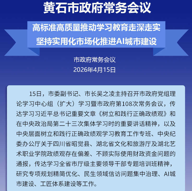 15日,市委副书记、市长吴之凌主持召开市政府党组理论学习中心组(扩大)学习暨市政府第108次常务会议,传达学习习近平总书记重要文章《树立和践行正确政绩观》和在中央政治局第二十三次集体学习时的重要讲话精神。