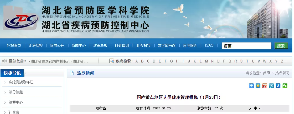 1月23日,湖北省疾病预防控制中心发布,国内重点地区人员健康管理措施。具体如下: