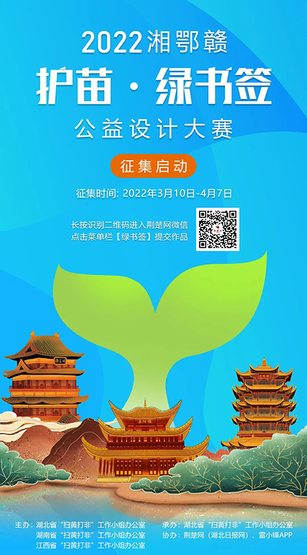 2022年3月10日-5月31日,为深入开展“扫黄打非•护苗”专项行动,打造跨区域“护苗”活动品牌,积极营造护助未成年人健康成长的社会文化环境,湖北、湖南、江西三省“扫黄打非”办公室决定开展2022年“护苗·绿书签”公益设计大赛活动。