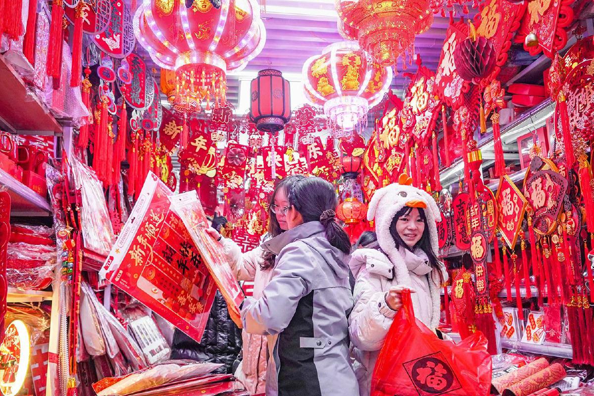 22日,市民在市场选购年货。进入腊月以来,各商超陆续将节庆商品摆上货架,琳琅满目的年货装点出浓浓的节日气息,喜悦温馨的氛围扑面而来。