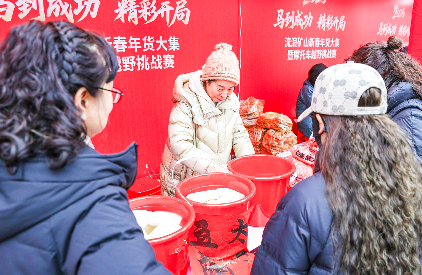 6日,大冶农发集团年货节开门迎客,一站式采购平台让市民不用跑远路,在家门口就能囤够实惠年货。7日的黄石,热闹更是翻了倍——开发区·铁山区的流浪矿山里,年货摊位一眼望不到头,太子豆腐、农家干货琳琅满目;一旁的摩托车越野挑战赛燃爆全场,骑手们追风逐速,每一次角逐都引来阵阵喝彩。