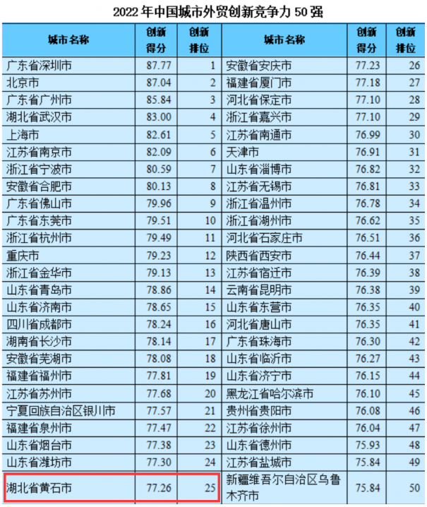 2022年中国城市外贸竞争力报告同步公布了中国城市外贸竞争力指标评价体系,黄石上榜2022年中国城市外贸创新竞争力50强,名列第25位。