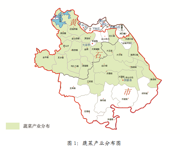 突出规模、品牌及绿色生态,优先发展蔬菜产业。到2020年发展蔬菜种植面积40万亩,带动贫困人口10000人。利用黄石市自然资源条件,因地制宜建成特色蔬菜产业基地,改善农田基础设施建设,提高蔬菜生产质量及产量。生产的种类以藜蒿及水生蔬菜为主,青椒、白菜、番茄等大棚精品蔬菜为辅,主要分布在韦源口镇、黄颡口镇、富池镇、白沙镇、浮屠镇、兴国镇、陶港镇、三溪镇、保安镇、陈贵镇、大箕铺镇、还地桥镇、金牛镇、金山店镇、灵乡镇、刘仁八镇、罗家桥街办、金湖街办、茗山乡、殷祖镇、大王镇、太子镇等地。产业分布如图1所示。