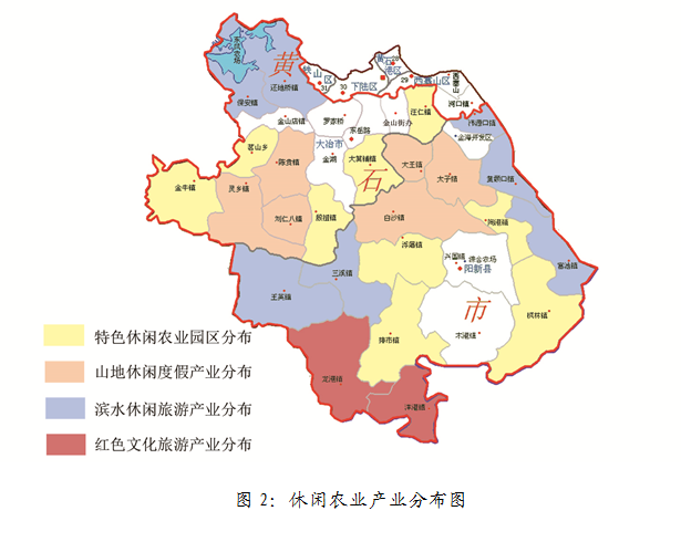 以建设全域生态旅游示范区为发展目标,全面推进全域休闲农业和乡村旅游,结合农耕文化和红色文化旅游资源,促进三产融合发展。到2020年实现休闲农业和乡村旅游接待1500万人次,培训休闲农业创业服务人员2000人,带动贫困人口10000人参与产业发展。重点支持茗山乡、金牛镇、殷祖镇、排市镇、枫林镇、浮屠镇、陶港镇、大箕铺镇、汪仁镇等以特色农业种养殖为基础,发展农业观光、休闲体验、科普教育等主题型农家乐、农业园区、民俗村、美丽乡村等项目;依托龙凤山、大王山、小雷山、七峰山、父子山等山地资源,重点支持刘仁八镇、灵乡镇、陈贵镇、白沙镇、大王镇、太子镇等地开展山地休闲度假、养生养老产业;依托保安湖、仙岛湖、王英水库、莲花湖、网湖、富河流域、长江流域等水资源,重点支持保安镇、还地桥镇、王英镇、三溪镇、富池镇、韦源口镇、黄颡口镇发展滨水休闲旅游;以龙港革命旧址群为依托,重点支持龙港镇、洋港镇发展红色文化旅游。产业分布如图2所示。