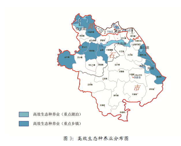 稳步扩大名特品种养殖面积,支持标准化养殖基地建设,做大做强河蟹、小龙虾、鳝鳅、龟鳖、鳜鱼、雄鱼、鲌鱼、黄颡鱼8大特色渔业产业,重点发展中科5号鲫鱼,同时稳定四大家鱼产业发展。支持现代渔业产业园建设,形成生产、加工、研发、文化、休闲等要素聚集区,实现一二三产业融合的新型产业形态,进一步拓展渔业功能,转变发展方式,提高渔业发展质量和效益,促进渔民多渠道增收。产业分布如图3所示。