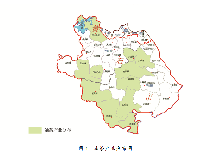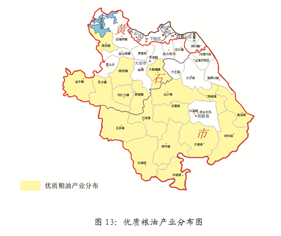 在大冶市、阳新县的粮油产业发展基础上,按照“规模生产、优化品质、提高单产”的目标,重点发展优质稻和双低油菜生产。到2020年高产粮食种植面积达200万亩,产量58万吨,油料种植面积80万亩,产量9万吨,带动贫困人口15000人增收。主要分布于阳新县的白沙镇、枫林镇、浮屠镇、富池镇、龙港镇、木港镇、排市镇、三溪镇、陶港镇、王英镇、洋港镇;大冶市以金牛镇为核心,辐射带动陈贵镇、大箕铺镇、灵乡镇、刘仁八镇、保安镇、殷祖镇。产业分布如图13所示。