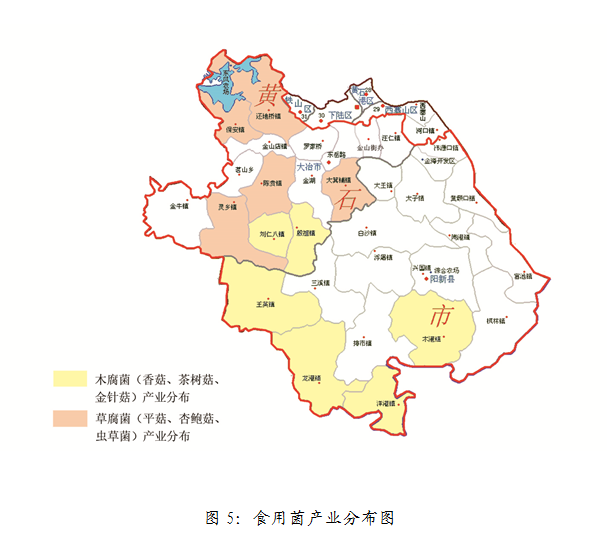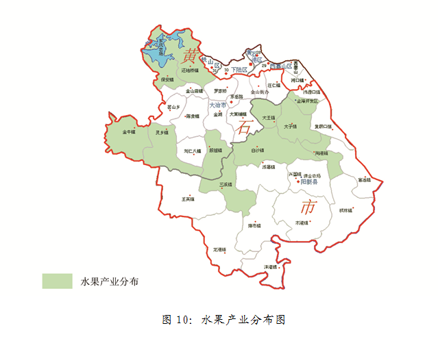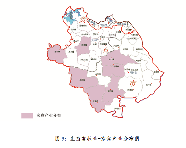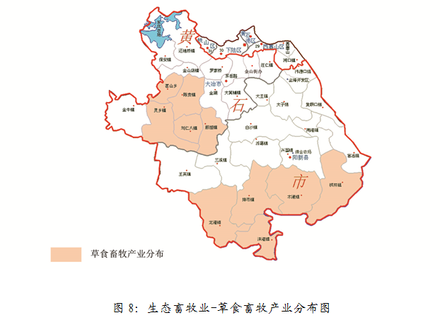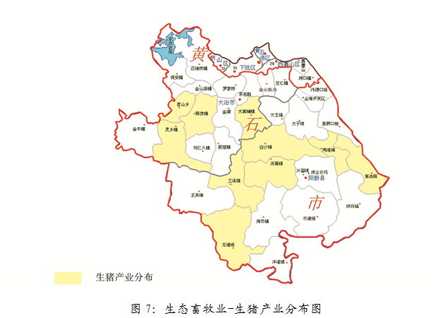 生猪产业:到2020年实现生猪出栏量达120万头,带动贫困人口5000人参与产业发展。重点支持茗山乡、陈贵镇、灵乡镇、大箕铺镇、白沙镇、浮屠镇、三溪镇、龙港镇、陶港镇、富池镇等地。产业分布如图7所示。