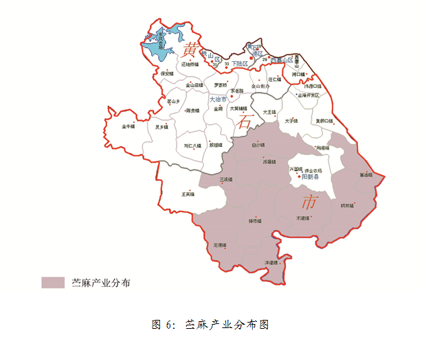 到2020年苎麻种植面积达10万亩,培训苎麻栽培管理贫困人口1000人次,带动10000贫困人口参与生产,脱贫增收。以白沙镇为核心,辐射带动浮屠镇、三溪镇、龙港镇、排市镇、木港镇、枫林镇、富池镇、洋港镇发展苎麻产业。产业分布如图6所示。