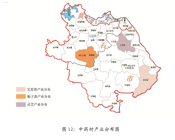 坚持科学规划、适度发展的原则,稳定适度发展中药材产业,到2020年中药材种植面积达10万亩,辐射带动贫困人口10000人。重点发展栀子黄、吴茱萸、灵芝等名优特色药;其中栀子黄以产业基础好的刘仁八镇和殷祖镇为核心,建设标准化示范种植基地,逐步扩大种植规模,辐射带动周边地区,进行适度发展;吴茱萸以枫林镇为核心、灵芝以太子镇为核心发展产业。产业分布如图12所示。