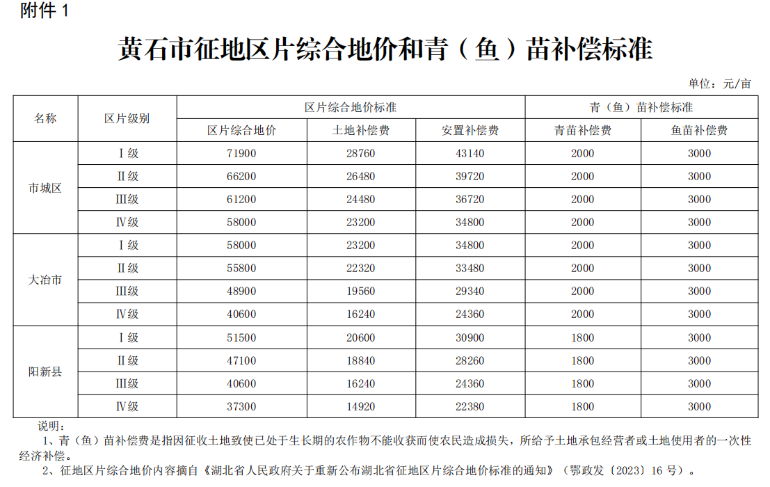 黄石市征地区片综合地价和青(鱼)苗补偿标准
