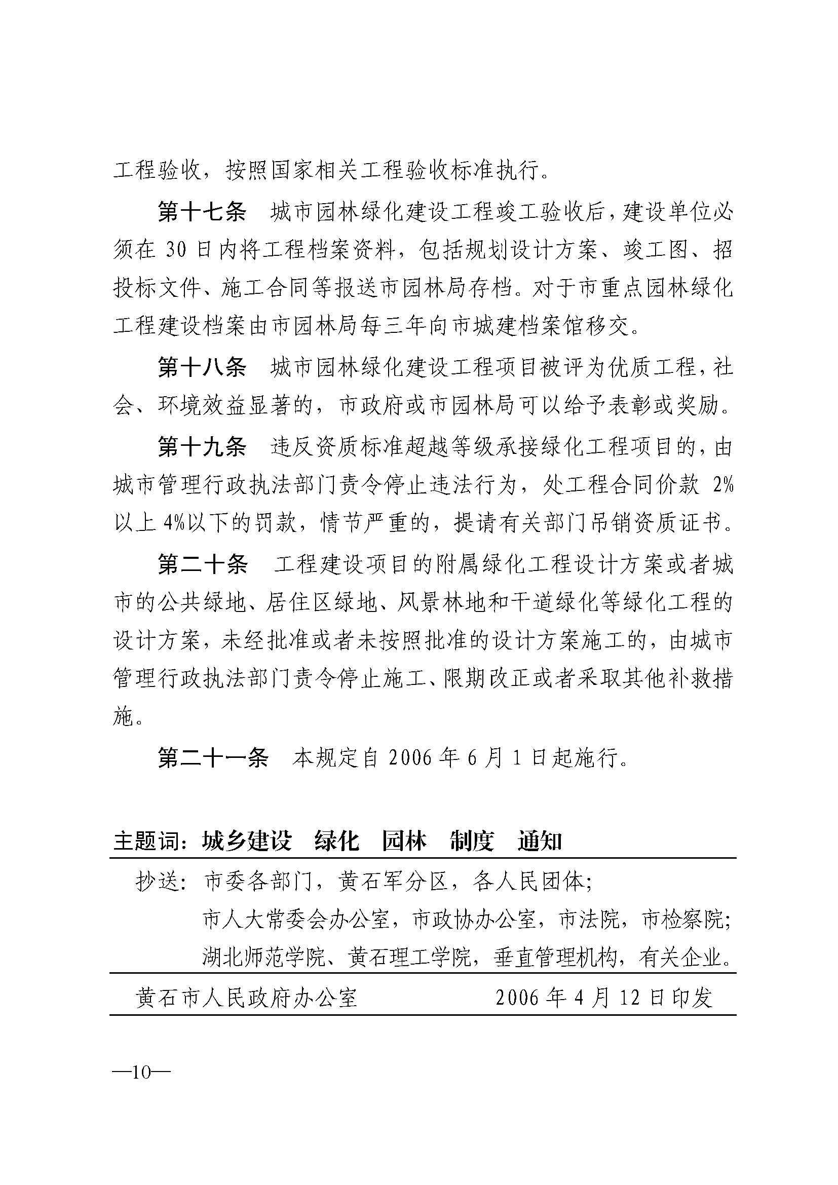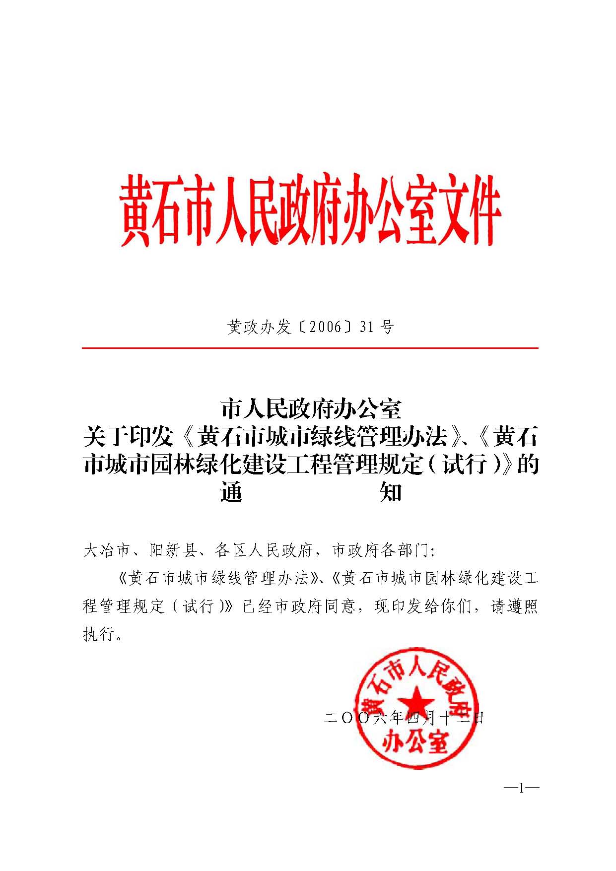 【失效】市人民政府办公室关于印发《黄石市城市绿线管理办法》、《黄石市城市园林绿化建设工程管理规定(试行)》的通知