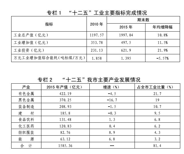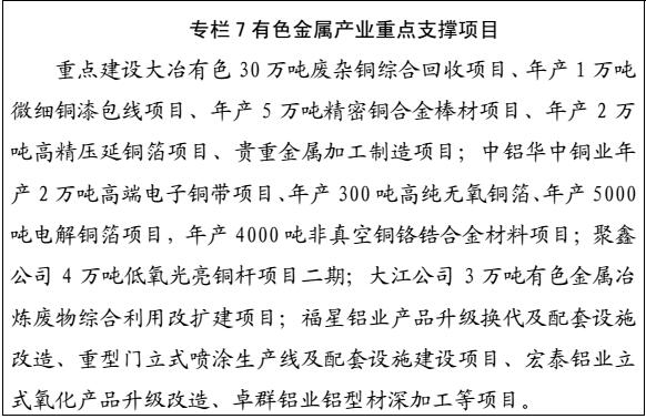 1、有色金属产业。推进技改提质、精深加工、资源综合利用,加快延伸铜产品加工产业链,提升铜铝冶炼技术,做强铜铝产品精深加工产业。到2020年,有色金属精深加工产业集群产值达到千亿元。