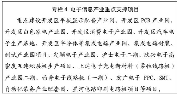 ——印刷电路板。以现有“有色铜-铜箔-PCB-电子应用”产业链为基础,不断发力产业高端,“拉长”、“加粗”PCB优势产业链。一是积极引进产业上游铜箔、覆铜板、专用材料和专用设备类企业,不断完善和壮大PCB产业链;二是引进和发展多层板、柔性印制电路板、刚挠结合板、高密度互连积层板、IC封装基板等技术含量高的PCB产品,提高PCB产品向智能手机、平板电脑、消费性电子、LED、汽车板等领域的渗透能力,提升黄石PCB产业的竞争力。三是要积极引进PCB产业的新技术、新工艺改造提升,推动PCB产业绿色发展。——平板显示。把握新型显示产业发展机遇,大力引进TFT-LCD显示、OLED显示重大项目,加快推动新型显示技术在下游智能终端的应用,力争在新型显示面板生产、整机模组一体化设计等领域实现突破,形成一定产业规模。一是支持PCB优势企业向平板显示领域拓展,发展显示模组等。二是围绕武汉深天马、华星光电等重大平板显示项目,引进玻璃基板、偏光片、驱动IC等一批平板配套项目。三是积极跟踪、引进激光显示、3D显示、互动显示等新型显示领域的重大项目。