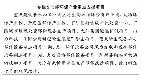 ——节能环保装备。加快推进大冶开发区环保产业园建设,创建国家级节能环保产业园;支持山力科技建立节能环保研究院,加快“气固分离新型除尘装置”除尘技术研发应用,向环保型装备企业转型。支持徐风环保、蓝天环保、蓝天除尘等企业推广脱硫脱硝、除尘、烟气净化等先进技术,加快环保技术装备产业化。支持网安科技开发智能变压器、智能化开关设备等智能电网设备和产品。