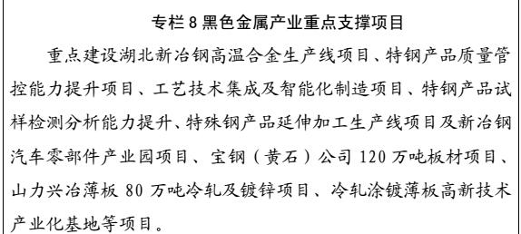——做优做强钢铁延伸加工。支持新冶钢“小批量、多品种、高附加值”的升级发展理念,大力发展特殊钢棒材、中厚壁无缝钢管、特冶锻造三大产品群,围绕高铁走出国门、页岩气开采新技术应用等机遇,重点发展以高速铁路车轴钢、精品轴承钢、高温合金、石油钻井管、航空航天高端合金和航空发动机用钢为主的高端特殊钢产品;围绕“一带一路”大规模基础设施建设,重点支持新冶特钢、新兴管业转移发展无缝钢管、球墨铸铁管及高档板材为主的工程类用钢优质产能;支持宝钢黄石公司、山力兴冶薄板等重点企业依托武汉汽车产业高度集中优势,重点发展以涂镀薄板、精密不锈钢冷轧薄板、高档亚光彩板为主的制造用钢和以轴承及轴承坯件、紧固件为主的机械基础件。争取到2020年,打造全球具有核心竞争力的特殊钢产业研发、生产、销售基地。