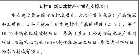 ——循环经济产业。重点实施循环经济“2234”计划,不断做大循环经济产业。支持下陆长乐循环工业园和开发区循环经济园2个循环经济园区建设;推进非金属矿产和金属矿产2个循环利用方向发展;推广华新水泥窑协同处置市政垃圾、大冶有色共伴生矿和尾矿综合回收利用、劲牌公司原料全产业链循环直供3种循环经济模式;积极发挥新冶钢、大冶有色、华新水泥、大江集团4个龙头企业示范带动作用。