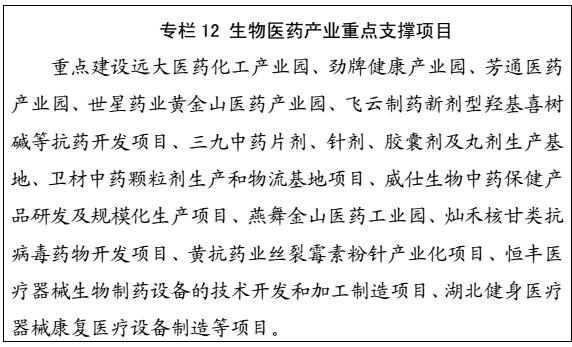 ——生物医学工程。以恒丰、湖北健身为龙头,实施高性能医学装备产业化、智能化行动计划,重点发展牵引系列、中药熏蒸系列、热疗系列、电磁疗系列等健康产品,引进和扶持女娲医学工程等企业做大做强医用针、医用管袋、注射器、输液器等医疗器材,打造先进医疗器械特色产业;以生物医学工程技术和先进医疗成套设备产业化为核心,积极引进生物疫苗、基因工程产品、组织干细胞工程产品等企业,努力建成国家级生物医学工程产业高地。