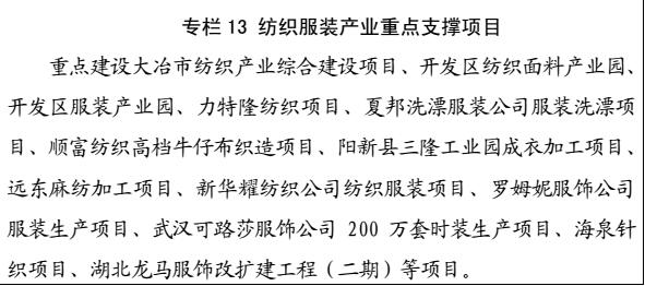 ——拉长纺织服装产业链。发挥黄石利达纺织针织面料资源优势,延伸成衣终端产品;扩大顺富纺织的织造规模,向上延伸棉纺,向下拓展水洗、服装,构建纺、织、服装一体化产业链,打造中部“牛仔之都”。以宝加鞋业、浙联鞋业为依托,拉长产业链条,建设阳新制鞋基地。完善产业配套,谋划建筑用膜结构材料、汽车用纺织品、防火阻燃面料等安全防护用纺织品。