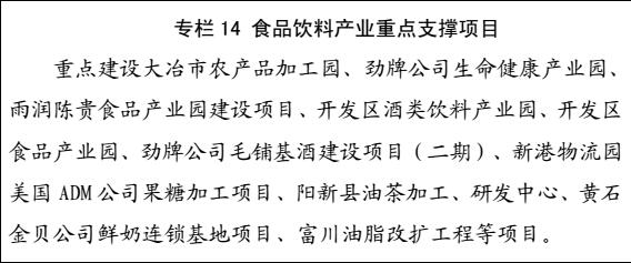 ——饮料酿酒工业。以建成全球保健酒生产基地为目标,重点建设劲牌公司生命健康产业园、毛铺基酒建设二期等项目,把“中国劲酒”打造成为中国保健酒第一品牌。围绕劲牌公司健康产业发展战略,积极发展扶持配套产业,全力支持劲牌拓展保健食品业务,打造世界一流健康食品企业;与此同时,积极发展无糖啤酒、保健啤酒。以青啤和华润啤酒为依托,开发中高档啤酒,提升品牌形象和产品档次。千方百计扩大“珍珠果米酒”生产规模和市场影响,大力发展茶饮料、果汁及果汁饮料、蔬果汁饮料、植物蛋白饮料和谷物饮料,打造具有资源优势的饮料产品。