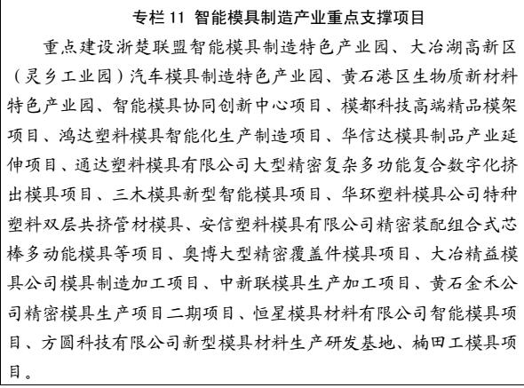 ——智能化模具。重点引进发展汽车、电子信息、注塑、压铸、冲压模具等精密、智能化模具行业。注重平台建设,推进科技创新,加强智能技术、智能测控装置的推广应用,加快3D打印在高端智能化模具的研发与创新,带动高效、精密、高性能模具产业总体水平的提高,推进模具产业全产业链向智能化、信息化、品牌化发展。