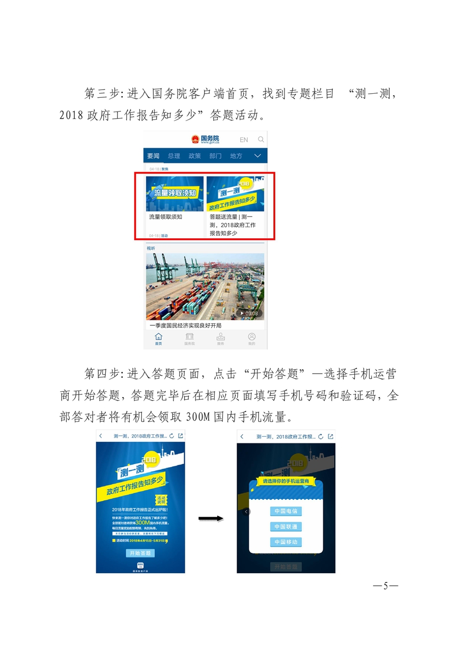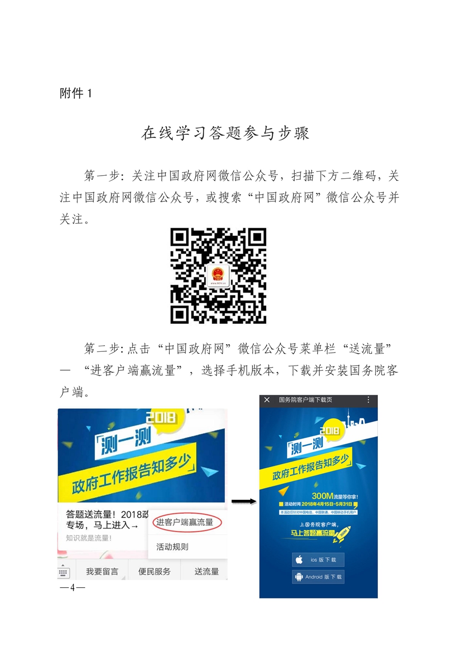 关注“中国政府网”微信、下载国务院客户端,在线学习“2018政府工作报告解读”专题并答题(详见附件1)。答对题目可获赠手机流量。