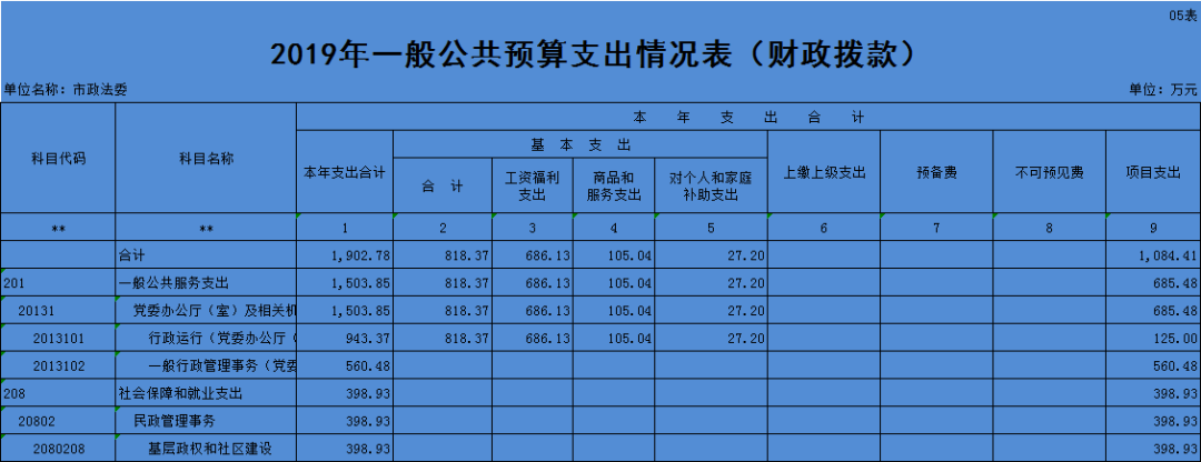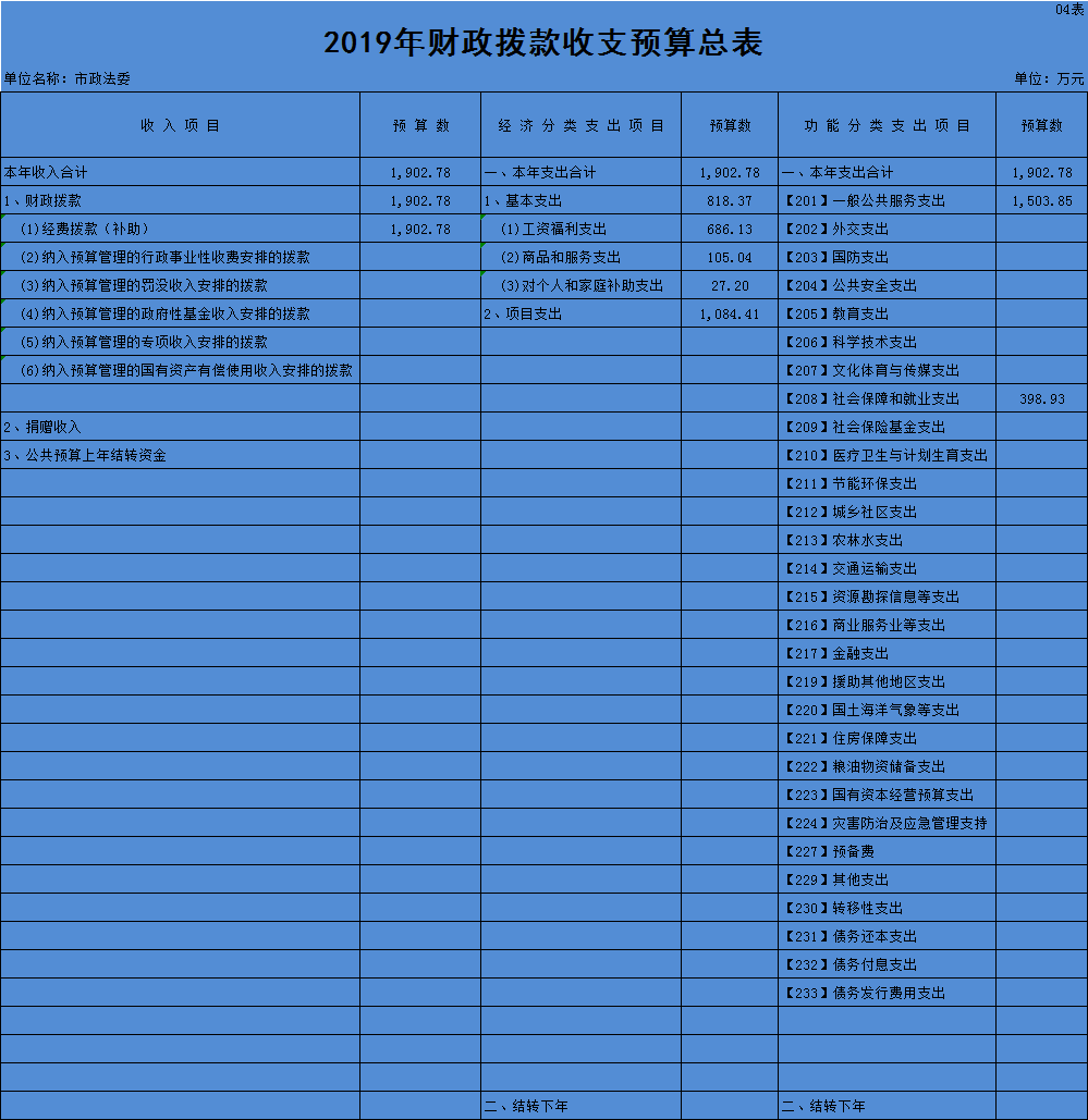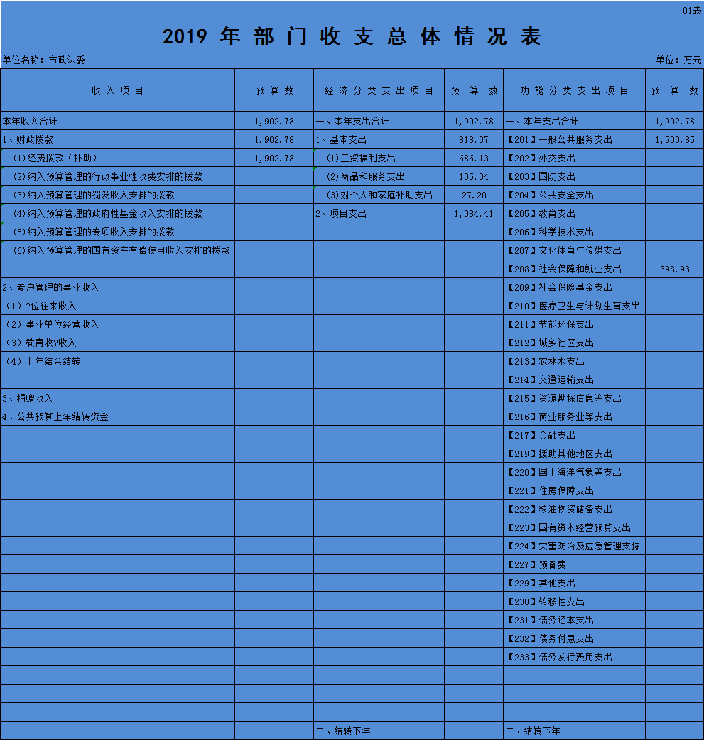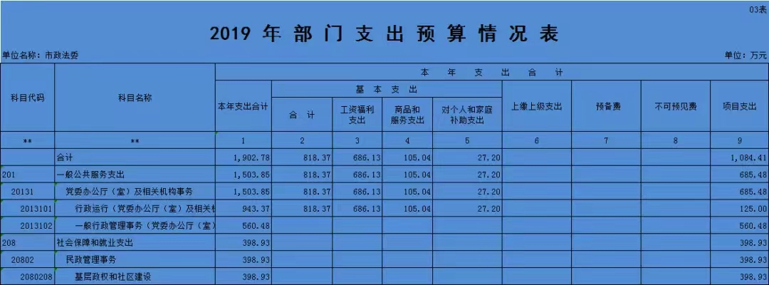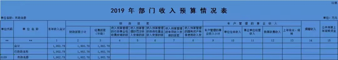 全年总收入1902.78万元,总支出1902.78万元。按支出项目:基本支出818.37万元(包含工资福利支出686.13万元,商品和服务支出105.04万元,对个人和家庭补助支出27.20万元),专项支出1084.41万元(包含律师参与涉法涉诉信访案件化解专项10万元,司法救助专项100万元,维稳经费150万元,农村、社区网格化建设专项310.48万元,扫黑除恶工作专项30万元,政法综治法治铁护国家安全610工作专项85万元,政法机关信息化建设专项398.93万元)。