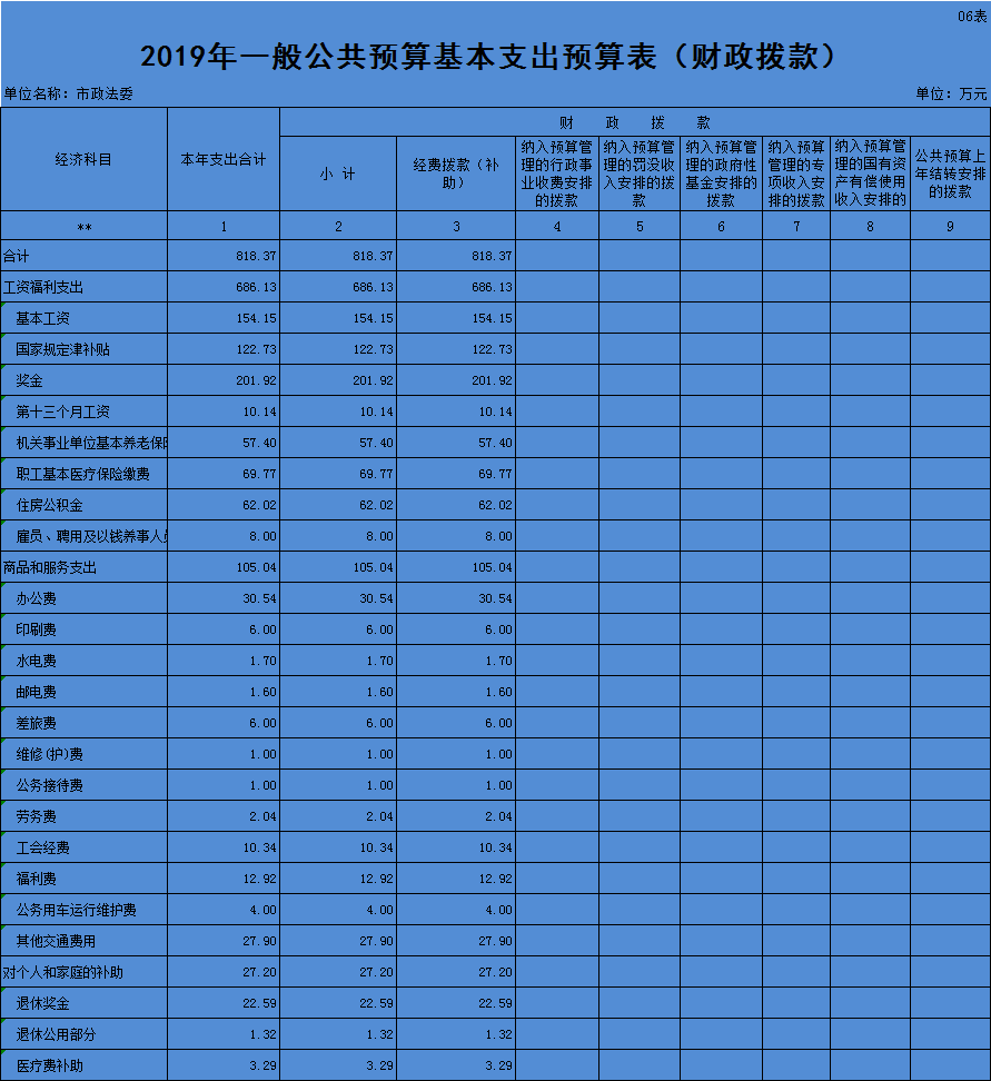 基本支出818.37万元(包含工资福利支出686.13万元,商品和服务支出105.04万元,对个人和家庭补助支出27.20万元),其中,商品和服务支出105.04万元包括日常公用经费49.88万元(包括办公费30.54万元、印刷费6万元,水电费1.7万元、邮电费1.6万元、差旅费6万元、维修(护)费1万元、公务接待费1万元、委托劳务费2.04万元)、交通费31.9万元、职工福利费23.26万元。