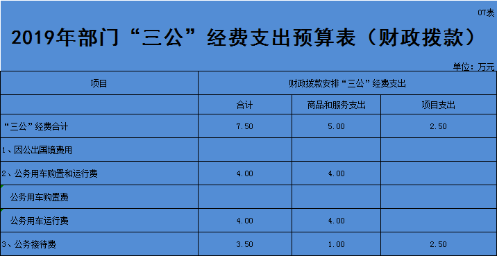 全年三公经费支出预算7.5万元,其中公务用车购置0元,公车运行费4万元,公务接待费3.5万元,因公出国出境费0元。与上年三公经费预算7.5万元持平。