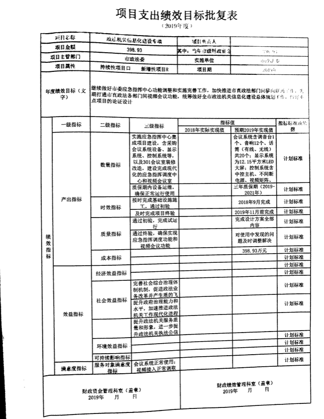 政法机关信息化建设专项达到应急指挥中心正常投入使用、全市政法机关信息化建设总体规划、重点项目论证设计的绩效目标。