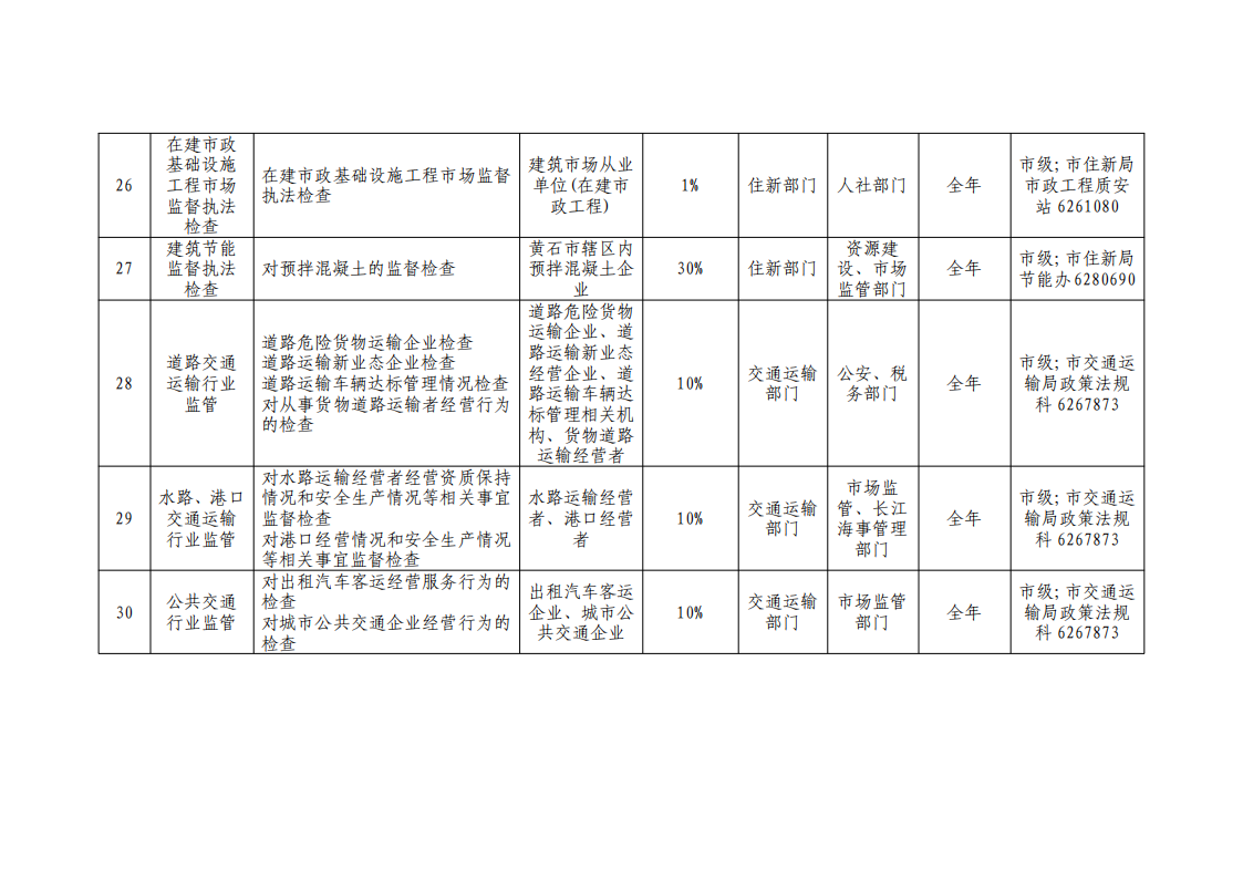 为进一步规范涉企行政检查,打造一流法治化营商环境,按照《国务院办公厅关于严格规范涉企行政检查的意见》(国办发〔2024〕54号)、《市场监管总局关于全面深化“双随机、一公开”监管规范涉企行政检查服务高质量发展的意见》(国市监信规〔2024〕5号)及《省市场监管局关于印发湖北省市场监管领域2026年度部门联合双随机抽查工作计划的通知》(鄂市监信监〔2026〕6号)要求,结合本地实际,现将《黄石市市场监管领域2026年部门联合“双随机、一公开”抽查计划》印发给你们,并就相关事项通知如下: