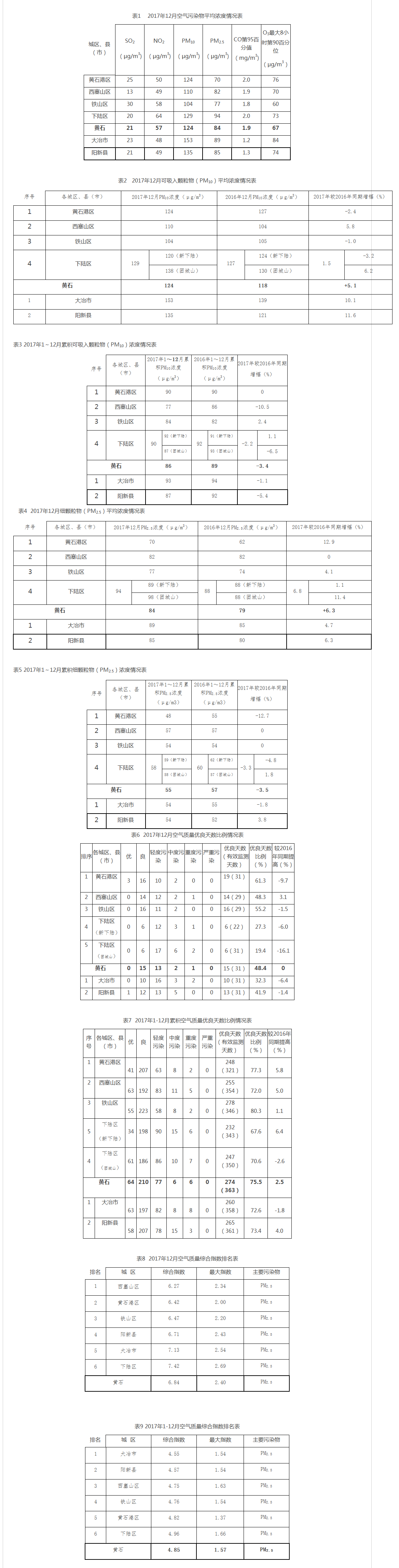 2017年12月,按照城市环境空气质量综合指数评价,空气质量监测结果相对较好~相对较差的县(市、区)依次是:西塞山区、黄石港区、铁山区、阳新县、大冶市、下陆区。