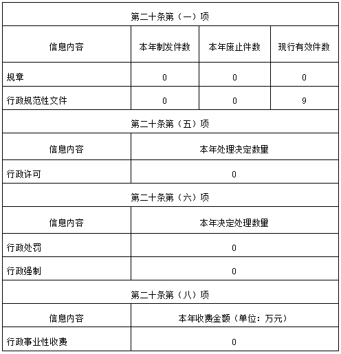2025年,我局新制作规章0个,新制作行政规范性文件0个,废止的规范性文件数0个,现行有效件数9个,行政许可事项0个,行政处罚事项0个、行政强制事项0个。