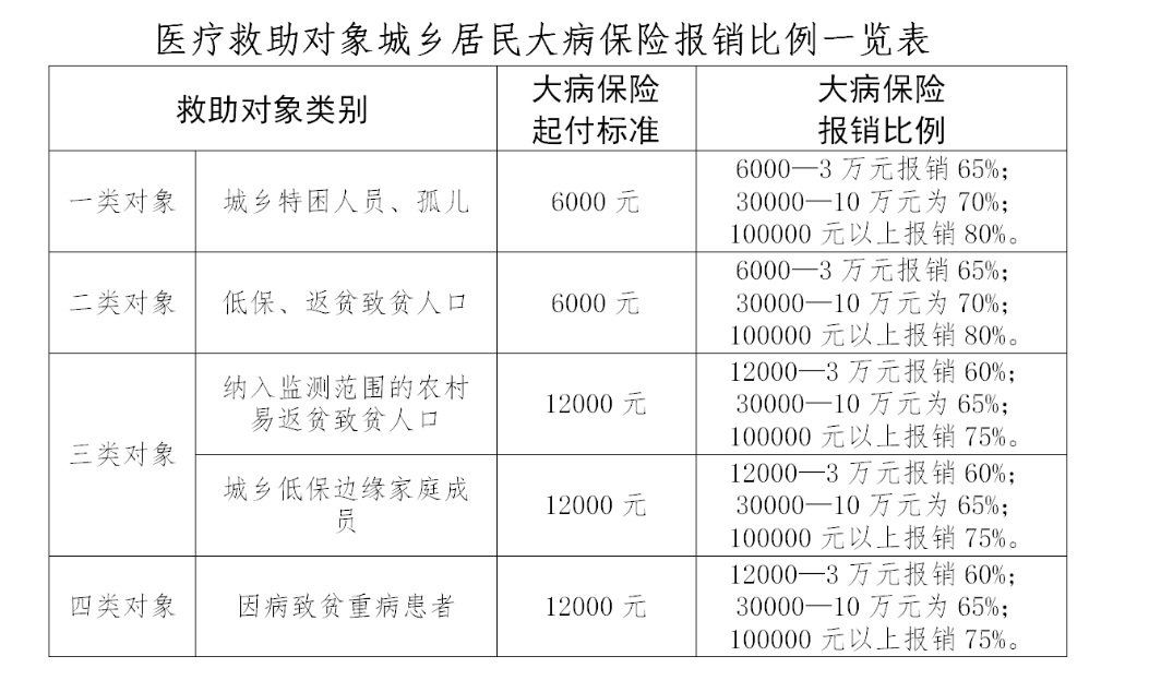 2. 城乡居民大病保险对一类、二类医疗救助对象实施起付线降低50%、报销比例提高5%、不设置封顶线的倾斜支付政策。