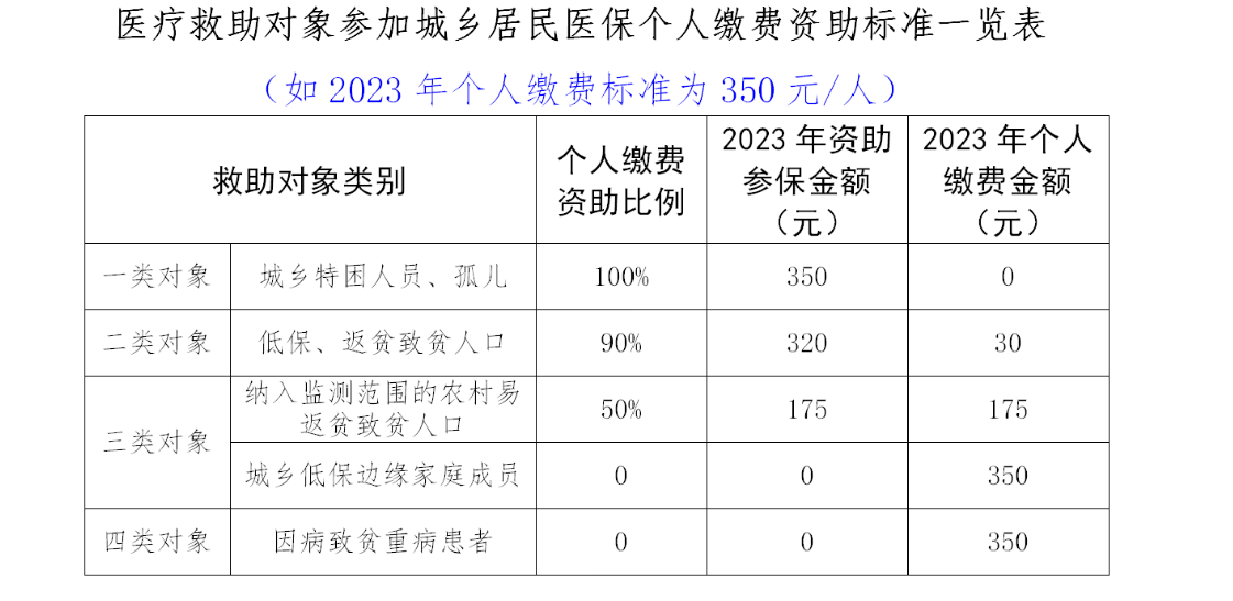 (1)资助参保。全面落实城乡居民基本医保参保财政补助政策。一类救助对象,全额资助;二类救助对象,按个人缴费标准90%比例给予定额资助(低于320元按320元资助);纳入监测范围的农村易返贫致贫人口过渡期内按城乡居民基本医保年度个人缴费标准50%比例给予定额资助。