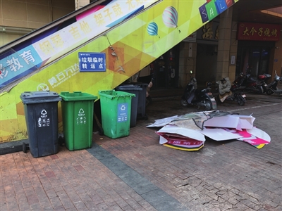 商户文明经营意识淡薄,沿线多家商铺出店占道经营,杂物乱堆乱放,环境保洁不到位,有暴露垃圾;垃圾桶未分类摆放且存在破损现象;沿街卫生间内卫生状况差,异味较重,墙上多处牛皮廯小广告。