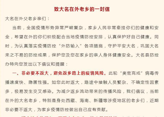 除了河南,近日,河北大名县也发布了致大名在外老乡的一封信,信中提到,此轮“奥密克戎”病毒传播速度快、隐匿性强。如您此时返大,路途中接触人员繁杂、不确定性因素多,极易发生交叉感染。