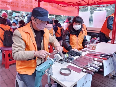 活动开始后,吸引了很多市民,免费磨刀、维修家电、测血压血糖等摊位前排起了长队。另外一边,几位义工围在一起,和糯米粉、搓汤圆,一个个圆滚滚的汤圆在大家的手中搓出来。“你看我搓得圆吧!”黄石日报社经营党支部的几位党员也加入其中,大家跟着义工们学习包汤圆,相互比拼,不亦乐乎。