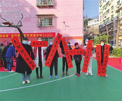17日,黄石日报社、黄石市诗词楹联学会联合市港口物流发展中心来到叶家塘社区滨江花苑小区,开展第三场“贺新春”原创春联惠民派送活动,五名书法爱好者为居民书写近期刊发在《黄石日报》的优秀原创征稿春联,将浓浓的年味浓缩于一笔一画,将新年祝福倾注于喜庆春联。