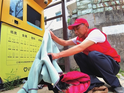 刘铭俊在清理废旧衣服