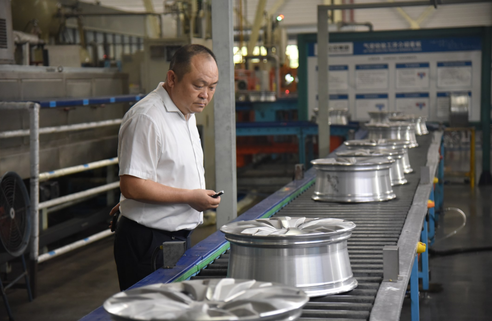 6月26日,在立中车轮(湖北)有限公司,公司总经理“新黄石人”余秋林正在认真比对检验刚生产出的轮毂。在他身侧,成千上万的成品整整齐齐地堆砌着,闪烁着明亮的银光,而在远处,更多的汽车轮毂正在源源不断地走下生产线。