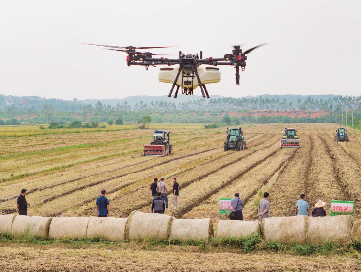 在荆头山农场田间,农机和植保无人机高效有序作业。