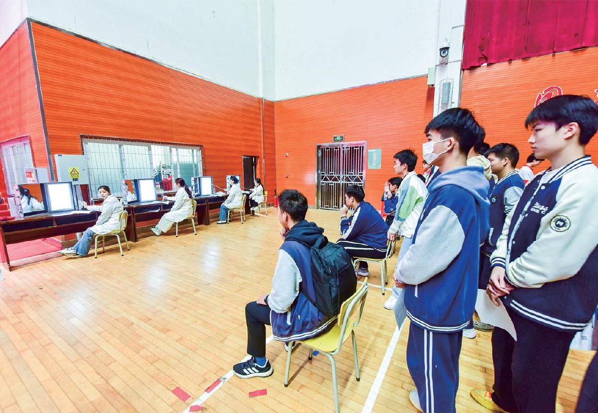当天,记者在黄石二中体育馆内的招飞现场看到,学生们正在工作人员的引导下按序排队,依次入场检查。此次初选包含眼科、外科、耳鼻喉科,采取单科淘汰制,三科检查均通过方可入选。