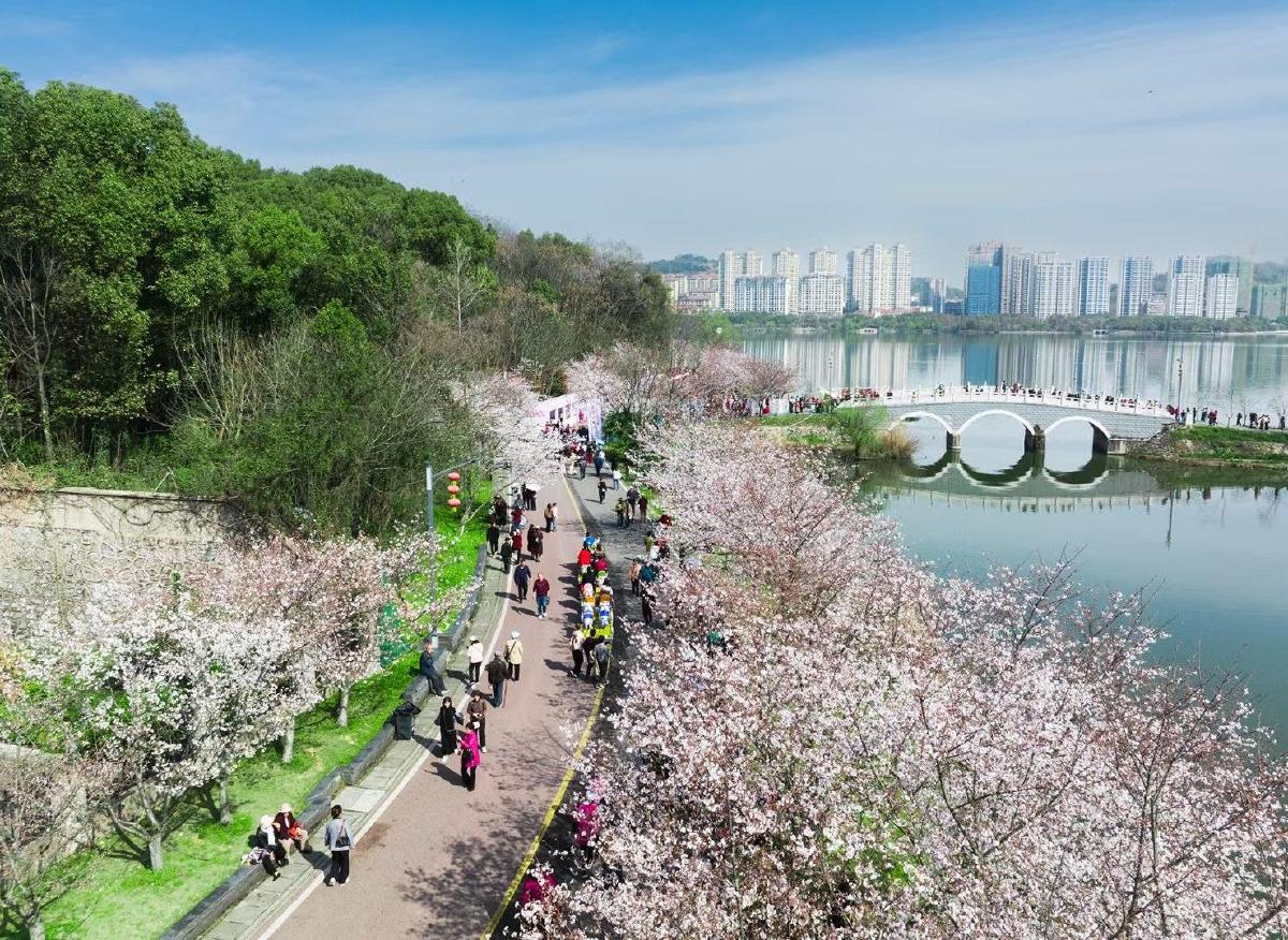 在团城山公园,经过近6年培育的2000余棵不同品种的樱花树,形成2.5公里的滨水樱花带。连日来,公园樱花大道游人如织,早樱挂满枝头,迎着阳光傲然绽放。“我们从大冶过来的,听说这里的樱花开放了,特意和好友相约赏花拍照。”游客潘女士说。