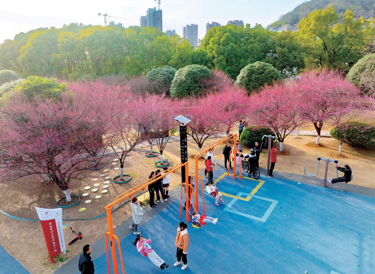 2月9日,桂花湾广场梅花怒放,市民在梅花林中的体育器材上健身。据了解,目前我市建有体育公园7个,一些城市广场也设置了健身设施,让市民在感受体育运动魅力的同时,尽览生态之美。(石勇)