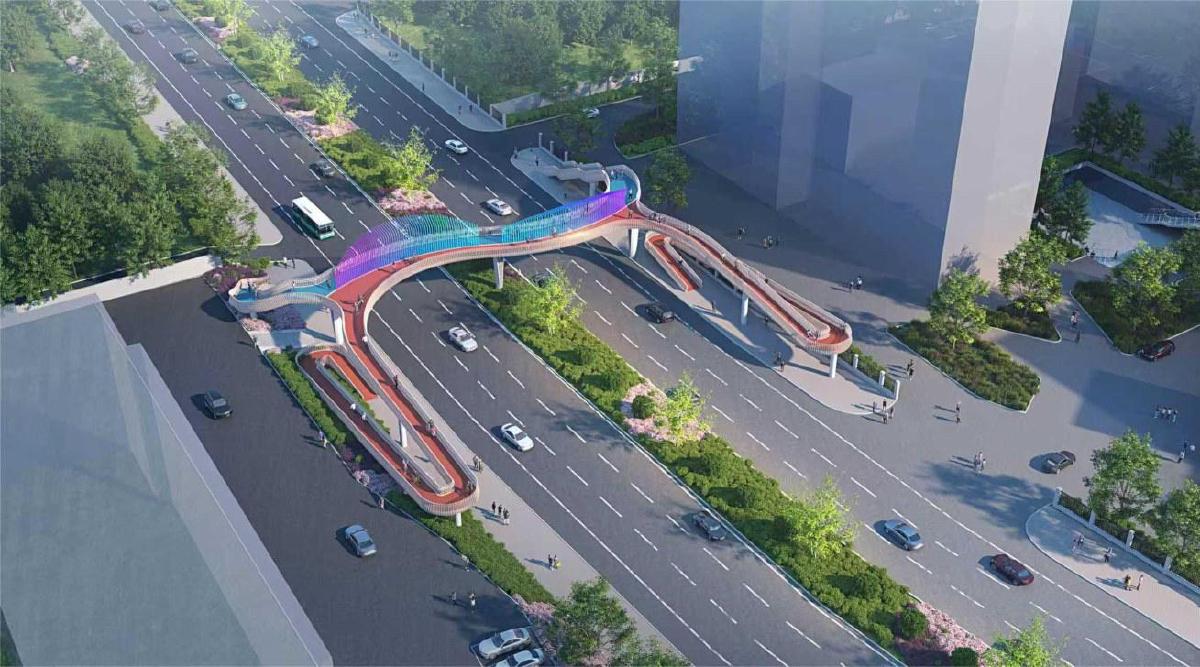 据了解,该人行天桥的外观设计因地制宜,主桥呈S型,校医院侧梯道呈C型,在满足天桥通行需求前提下,减少对现有人行道的占用;人行栏杆以“外挂”的方式附着于桥梁两侧,立面采用独特造型,桥面中心设置变高圆管格栅加以点缀;踏步照明区域以功能照明为主,桥面通过单色静态光、自下而上投光形式,整体以自然内透为主,避免过度照明;桥墩设计参照毛笔笔架,表面真石漆涂装,外侧铝板包裹。该桥设计新颖,建成后有望成为新的网红打卡点。